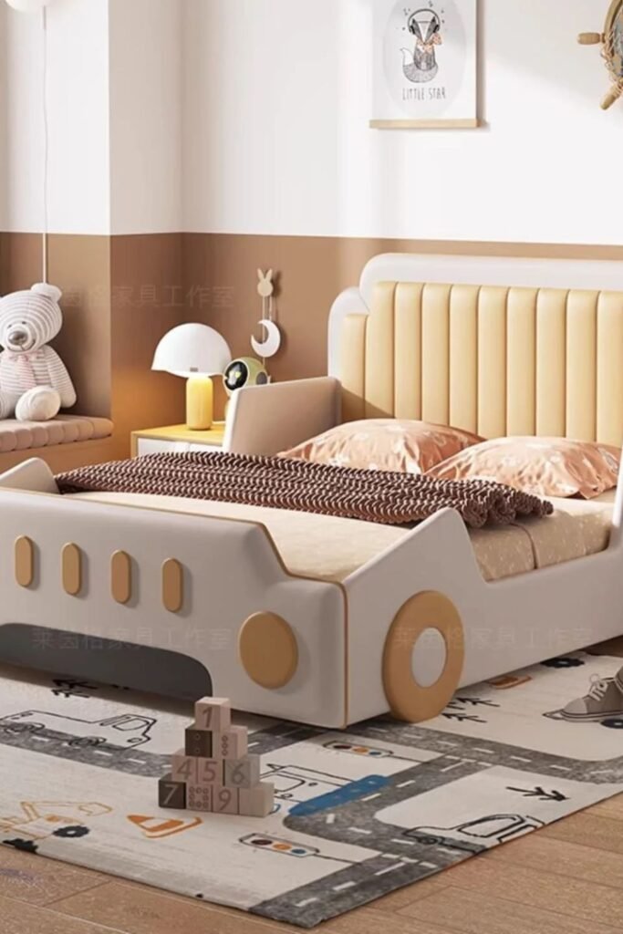 Speed meets comfort in a setup like this. A car-shaped bed keeps imagination alive while still giving enough structure for a growing child.