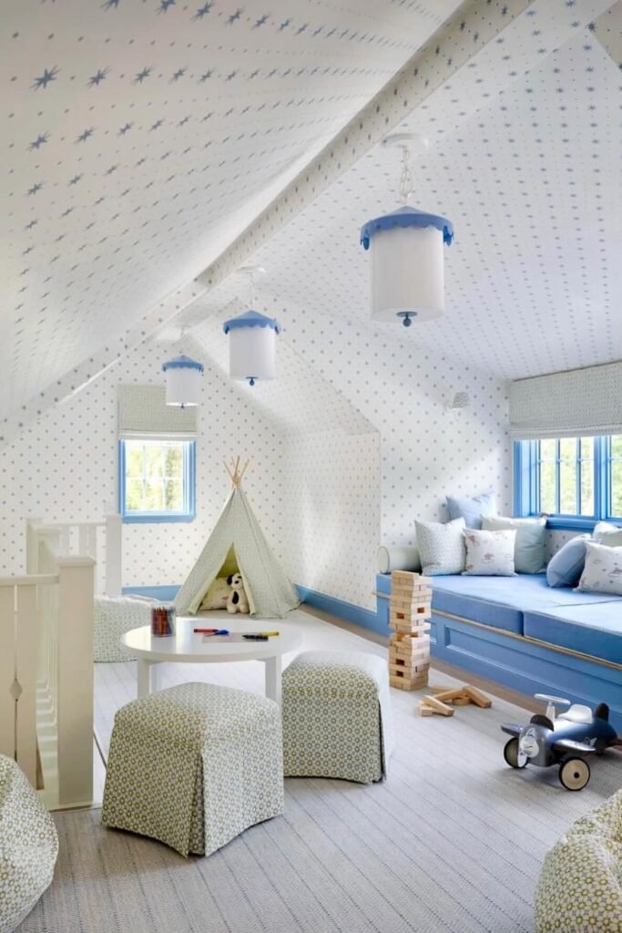 Keeping the lower half of the room calmer allows toys and furniture to stand out without visual overload.