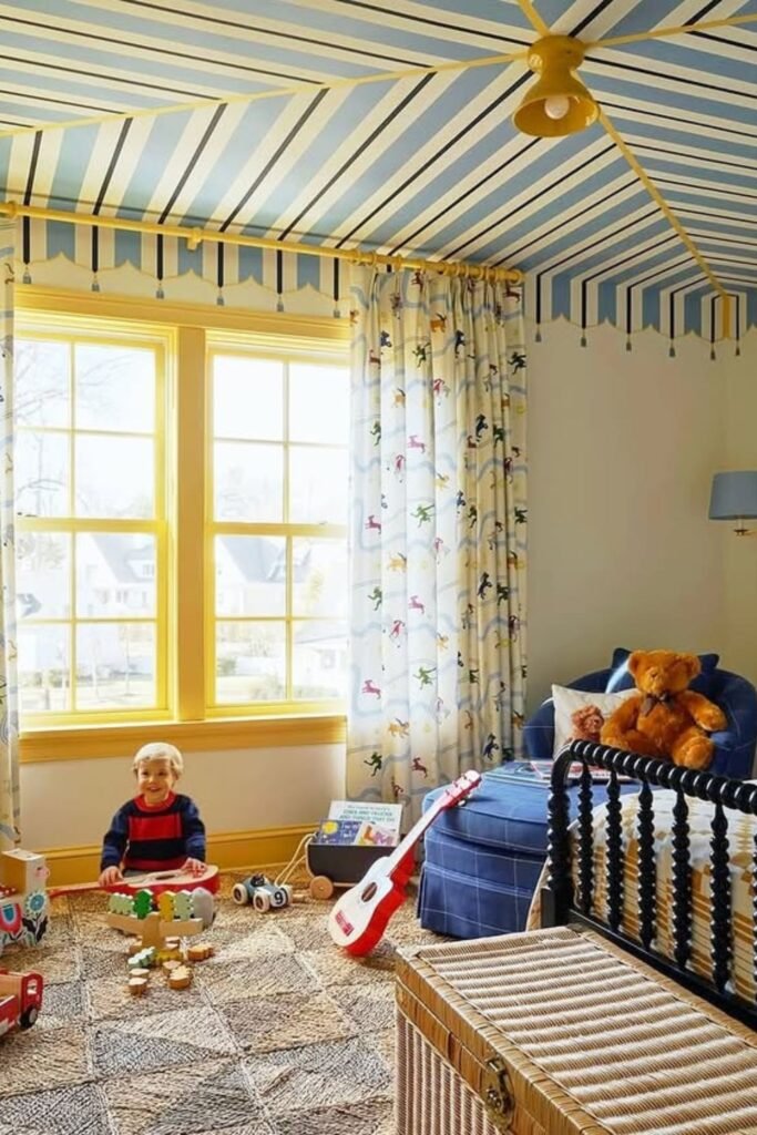 Eyes naturally go up in a room like this. Bold ceiling stripes turn a simple bedroom into something playful without crowding the walls.