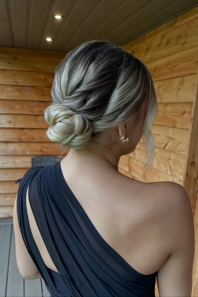 Low bun has a smooth shape thanks to soft twists along the sides. It works well with formal birthday meals or any clothing with an open back.