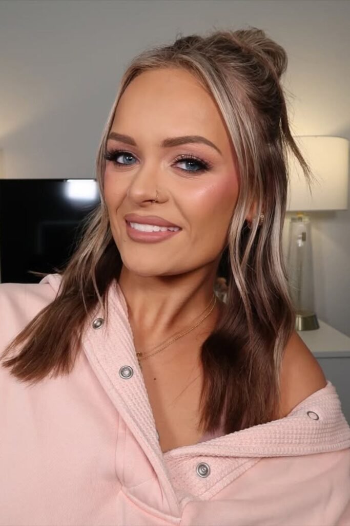 Face-framing strands shape this half-up style in a way that suits casual or at-home birthday plans where you want hair off your face without going full glam.