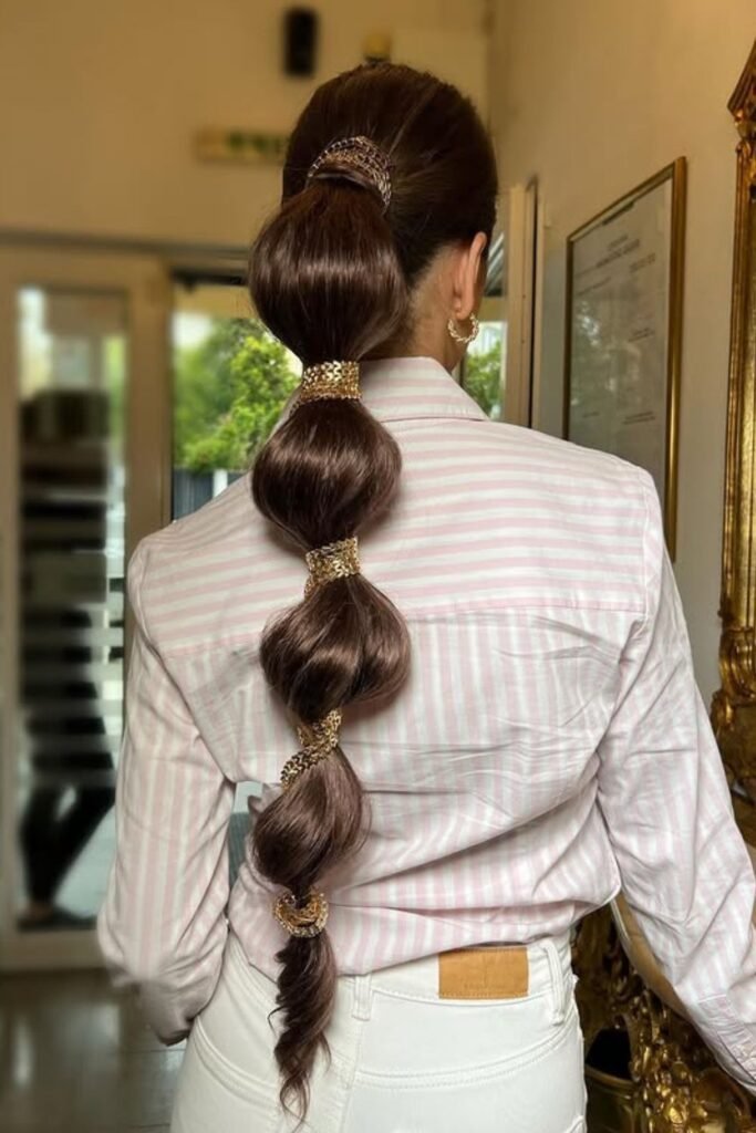 Layers of rounded bubbles turn a simple pony into a full-on birthday statement, especially when you add gold cuffs to highlight each section.