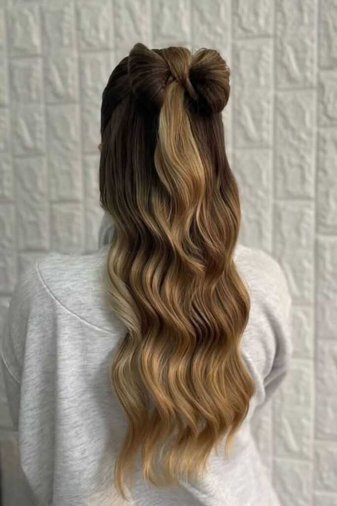 A bow made from your own hair instantly turns long waves into a playful birthday look.