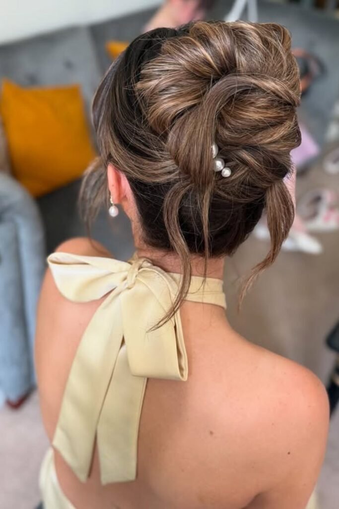 Twisted bun looks fancy with the lift through the crown. It’s perfect for birthday dinners or any other time you want your neckline to be open.