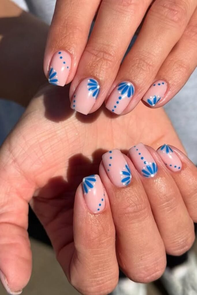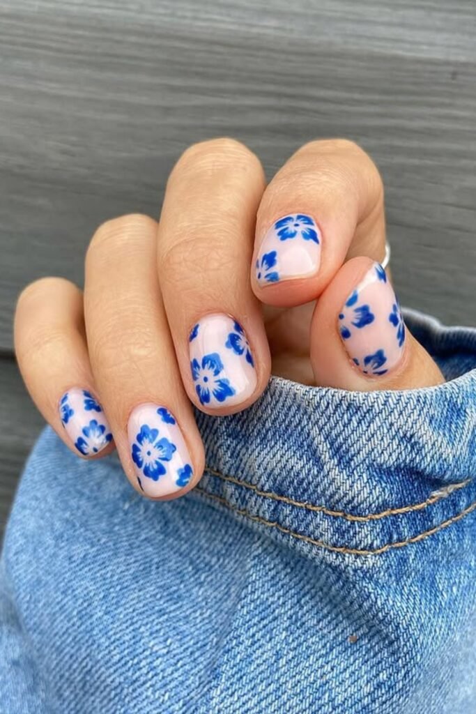These nails are relaxed and charming since they have hand-painted blue flowers on a nude foundation. They are like your favorite denim jacket for your nails.
