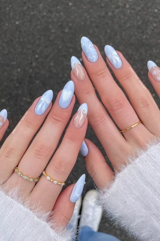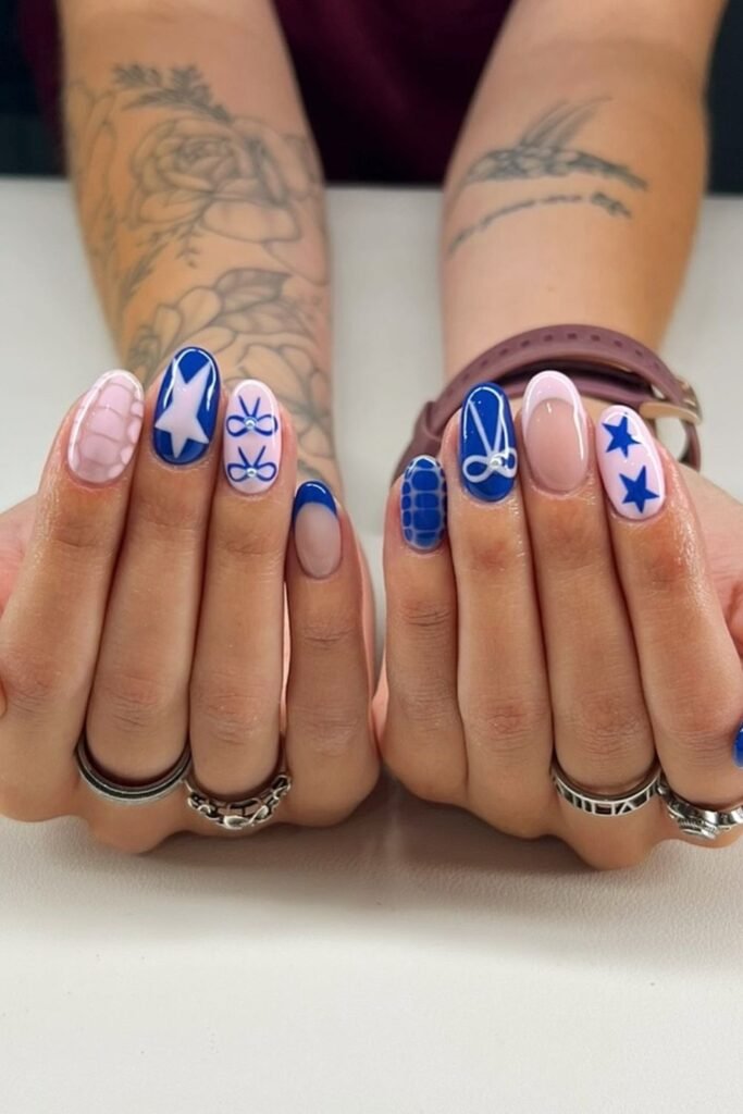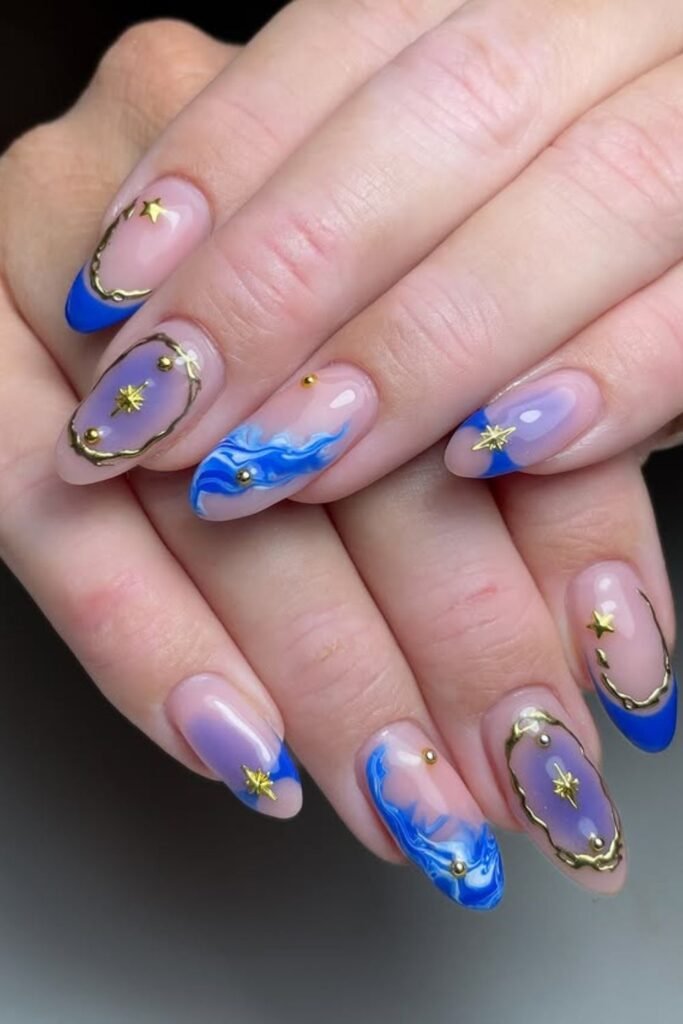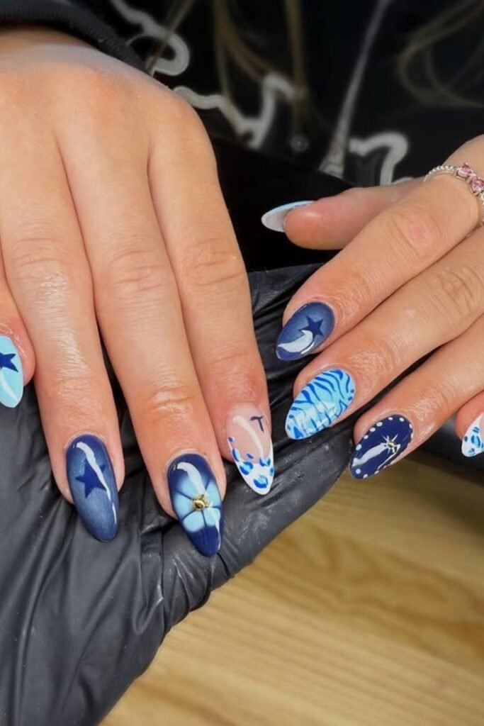 This mix of deep navy, sky blue, and art accents makes your nails tell an entire narrative without much trouble.