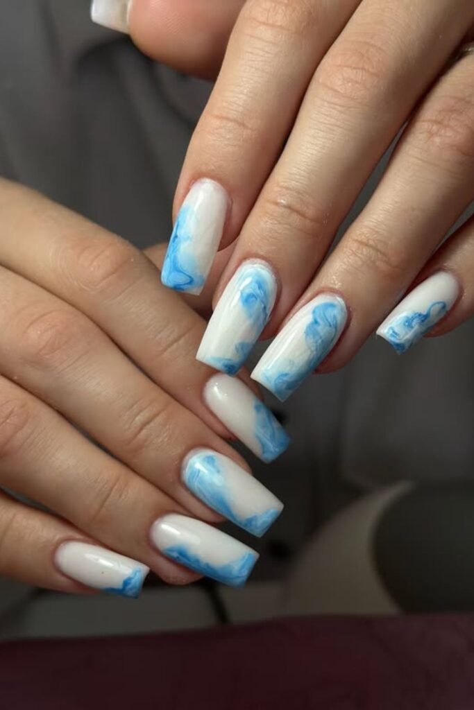 These milky white nails with light blue marble swirls look like smoke floating through clouds. They are soft but very pretty.