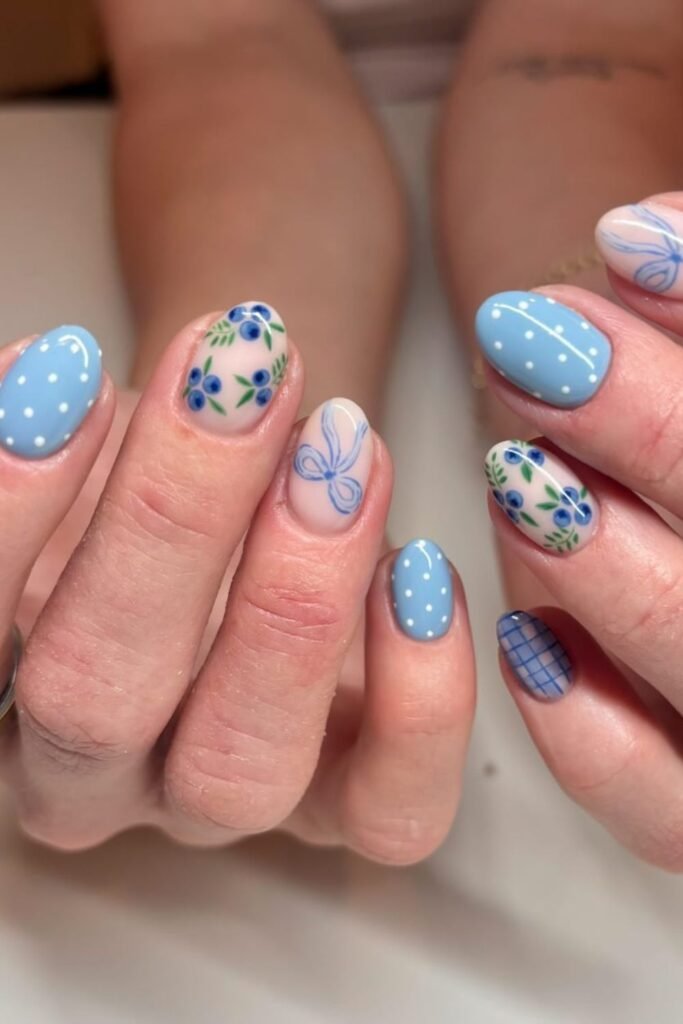 These nails have a pleasant, homemade look thanks to the little flowers, dots, and gentle blue checks.