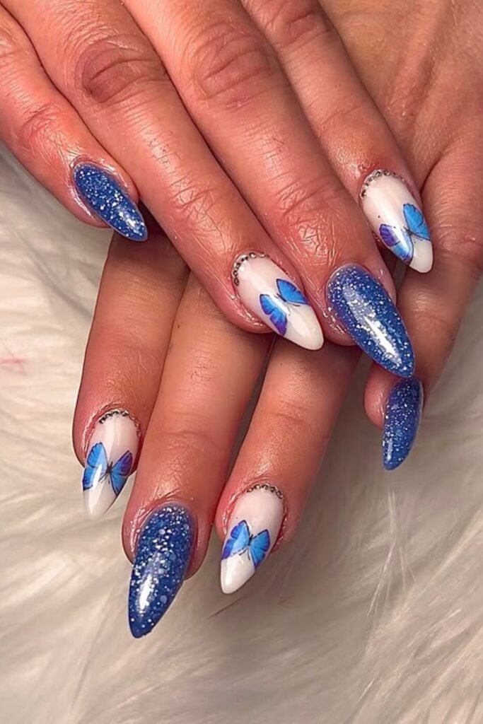 The combination of glittering blue polish and hand-painted butterfly wings on a white base gives the look a fun but classy twist.