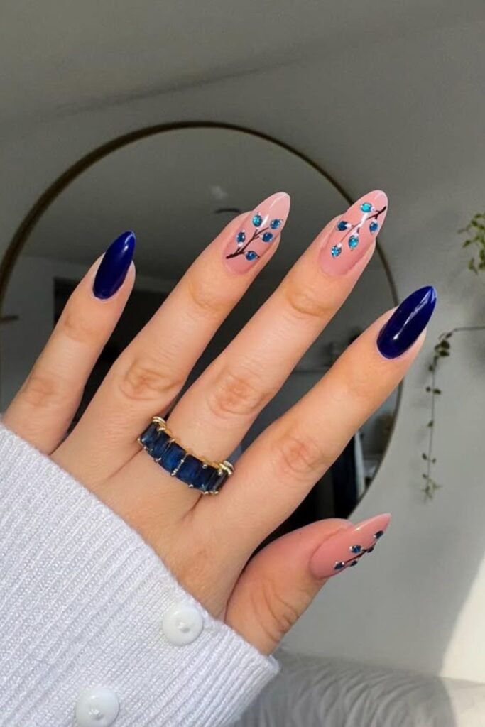 The dark navy nails create drama, and the nude accent nails with blue rhinestone flowers on them give the look a gentle, feminine touch.