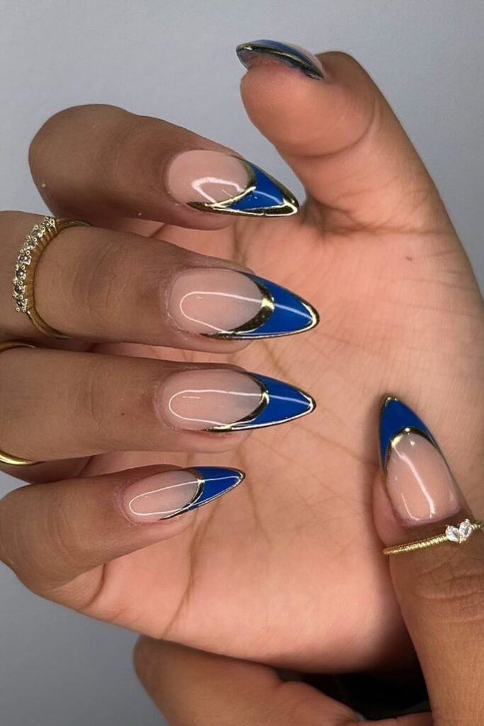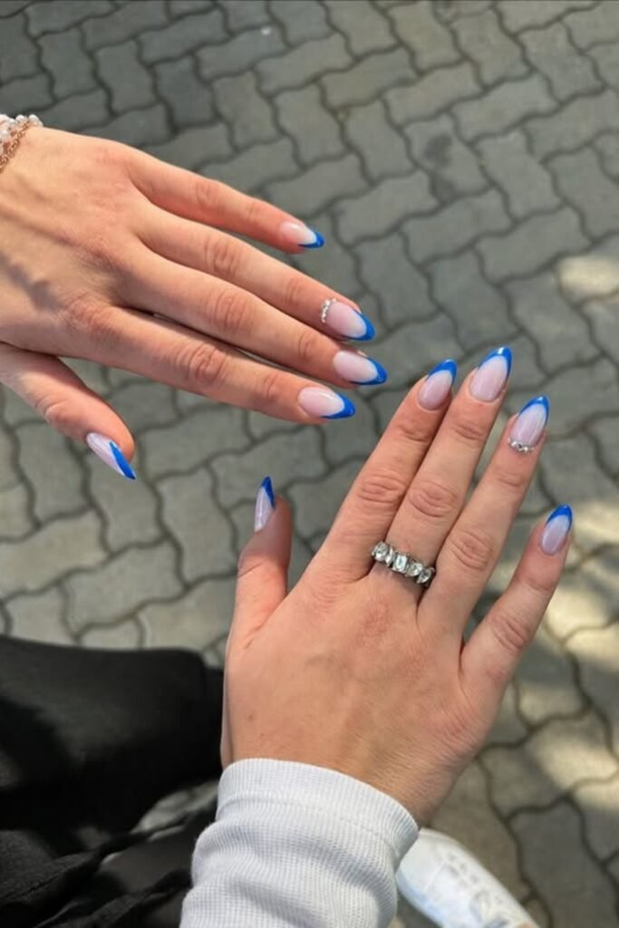 The pointed cobalt-blue French tips make your fingers look longer right away, and the tiny rhinestone accents provide a touch of luxury without going overboard.