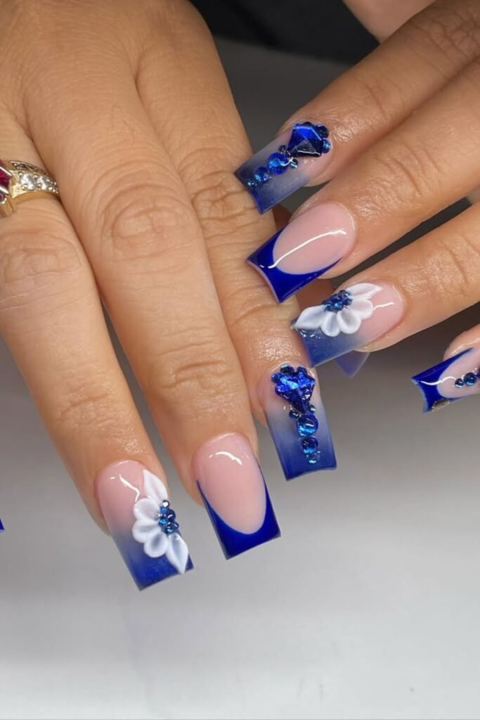 The royal blue gradients, white 3D flowers, and crystal decorations all work together to make a very luxurious look.