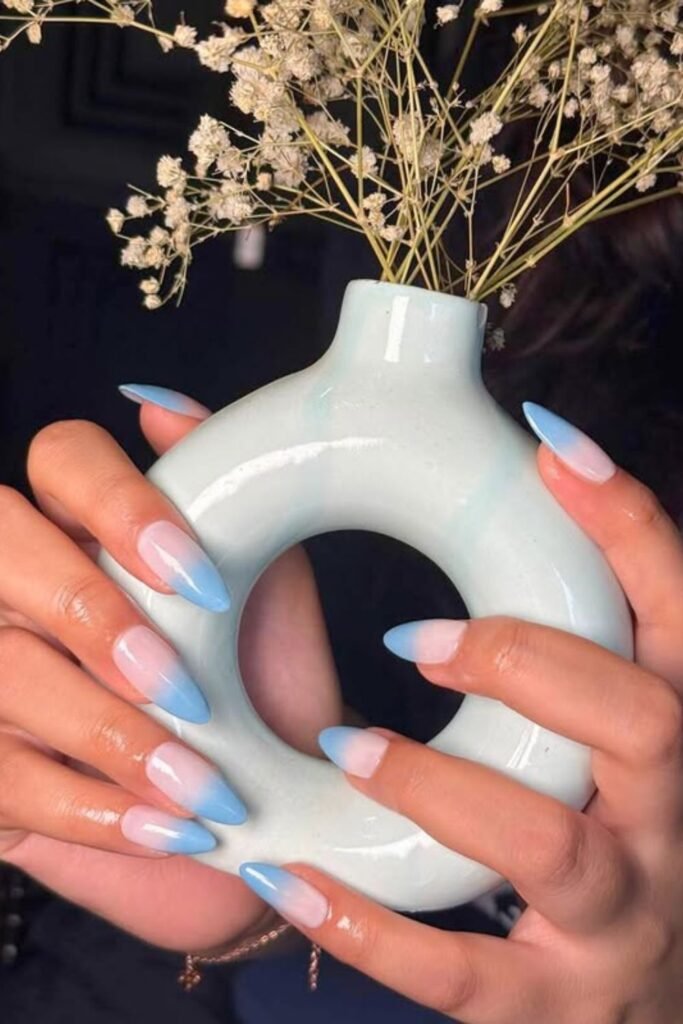 These ombré blue nails appear like the sky fading into the day. They are soft, airy, and easily gorgeous.