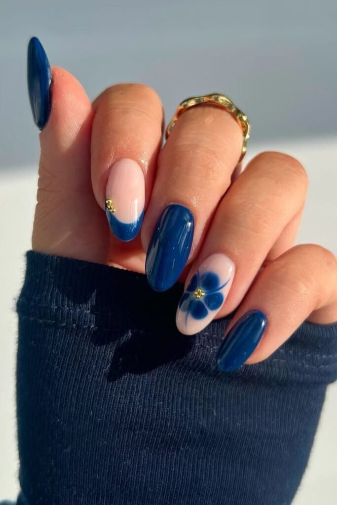 This mix of navy and sheer floral elements is perfect for when you want your nails to seem feminine yet still strong.