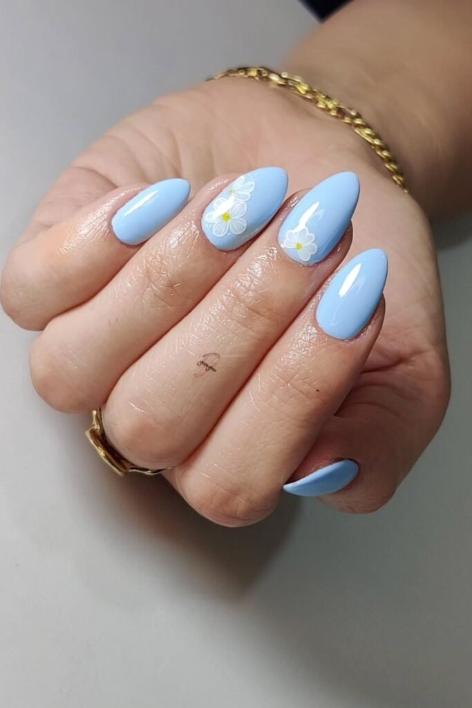 Tiny daisies on this soft baby-blue manicure make it seem better and make you feel better right away.