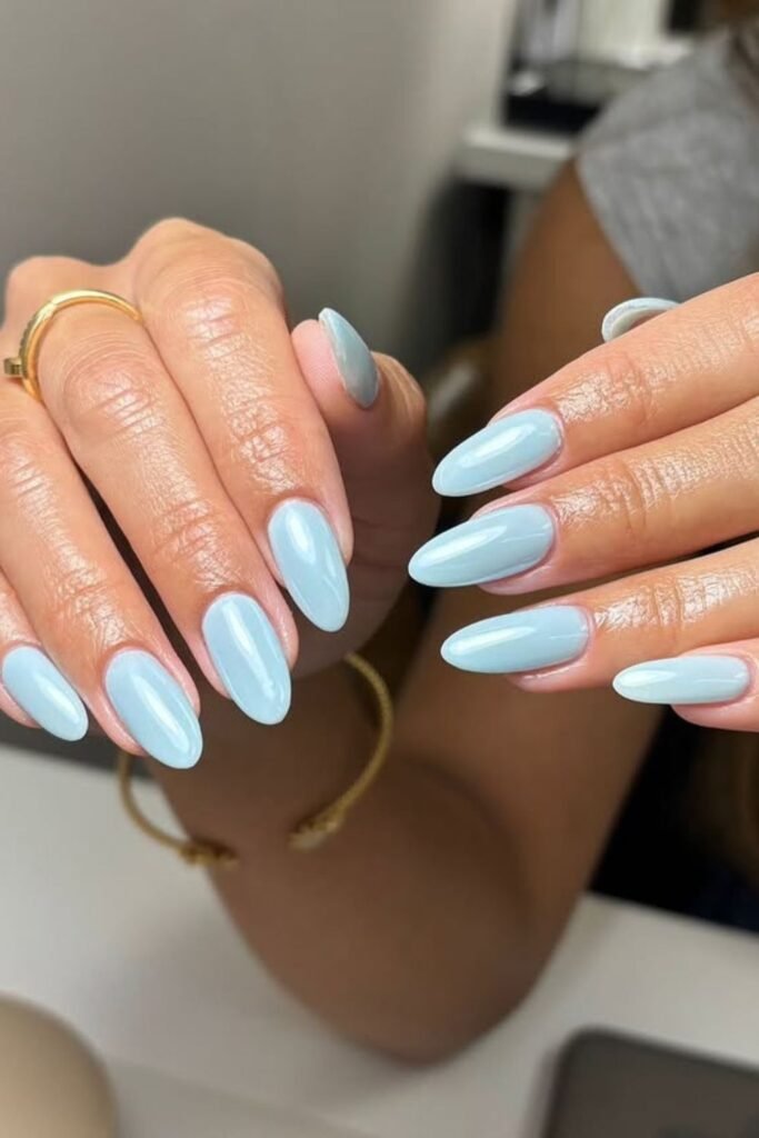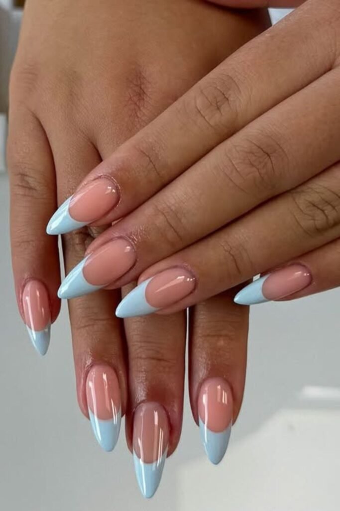 This baby blue tip on almond nails is the perfect balance between glossy and not too dramatic.
