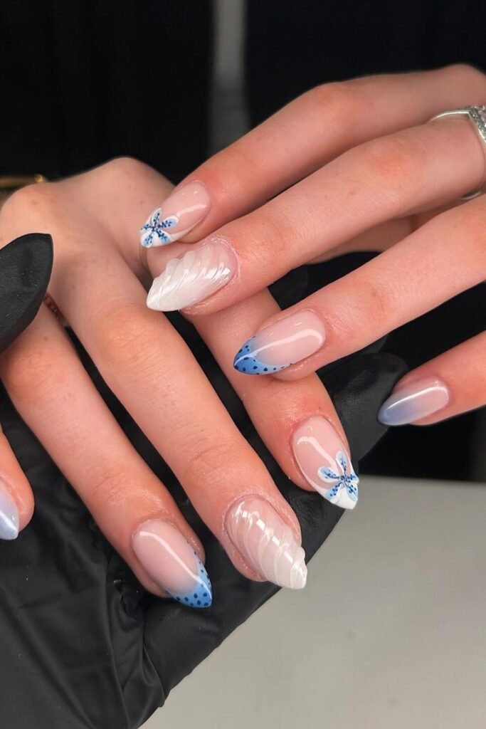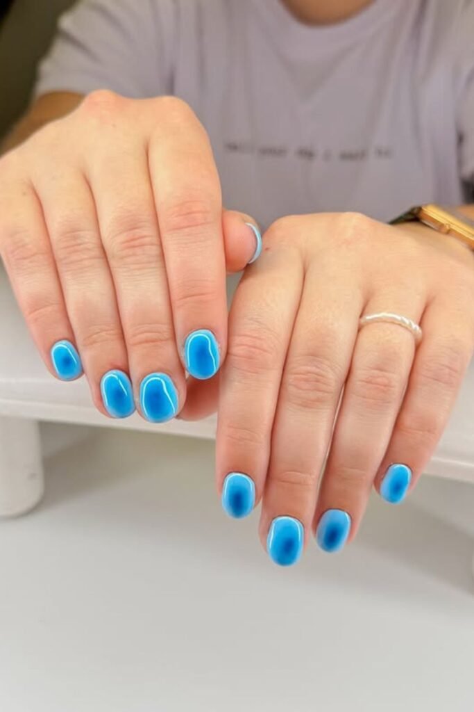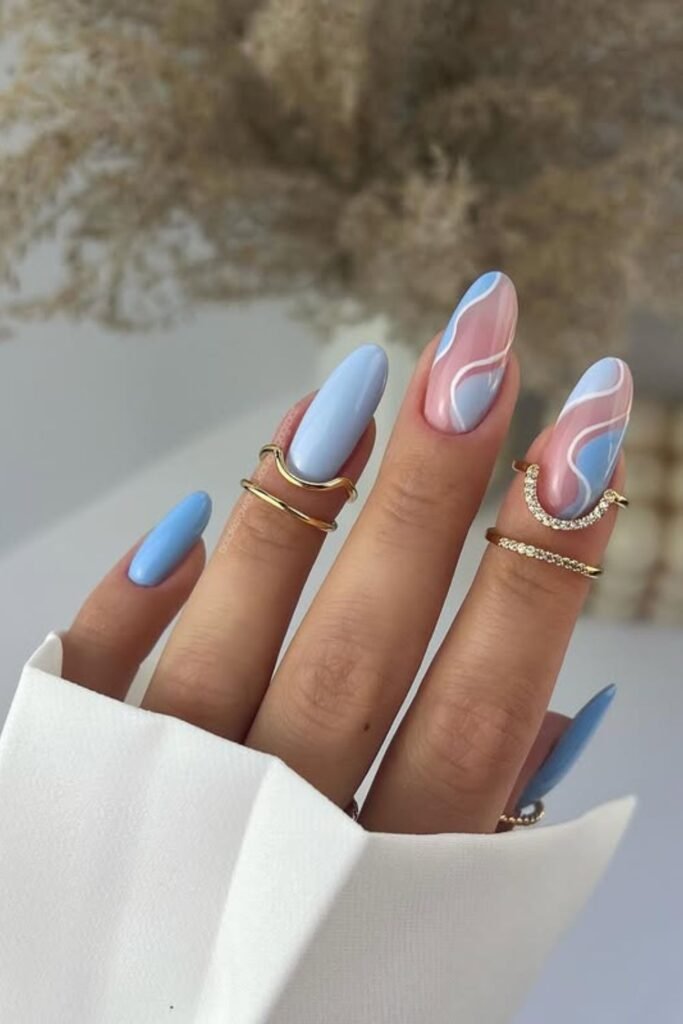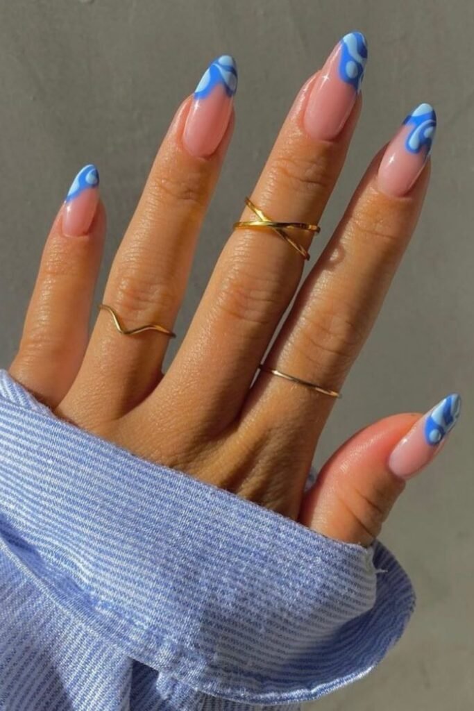The gentle blue tones and wavy abstract patterns on the tips give the look a modern, fun edge.