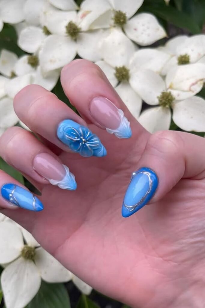 The 3D flower on the nails gives them depth and structure, and the combination of glossy sky blue and soft nude base keeps it balanced and feminine.