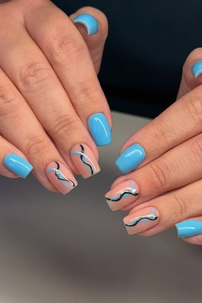 The wavy black and white lines that run across the transparent tips of these sky-blue nails give them a smooth flowy look that makes them look nice.