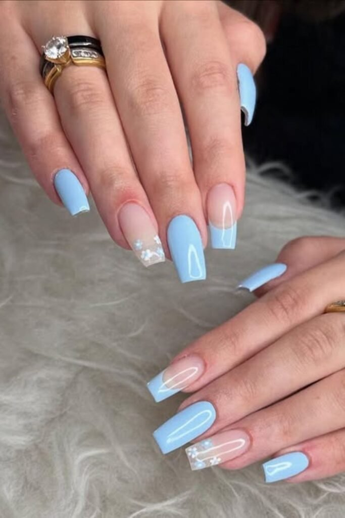 Baby blue or sky blue are examples of light blues look neat and polished with square or squoval nails.