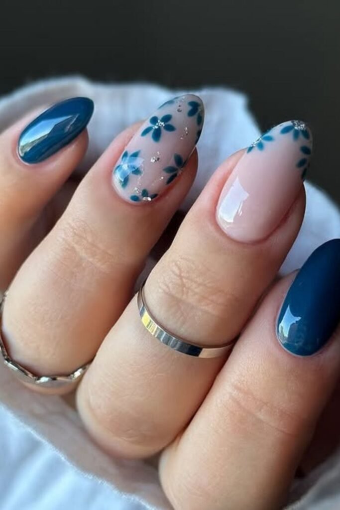 The dark blue polish makes the nails look deeper, and the clear nails with dispersed flowers make them look softer.