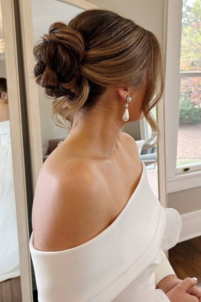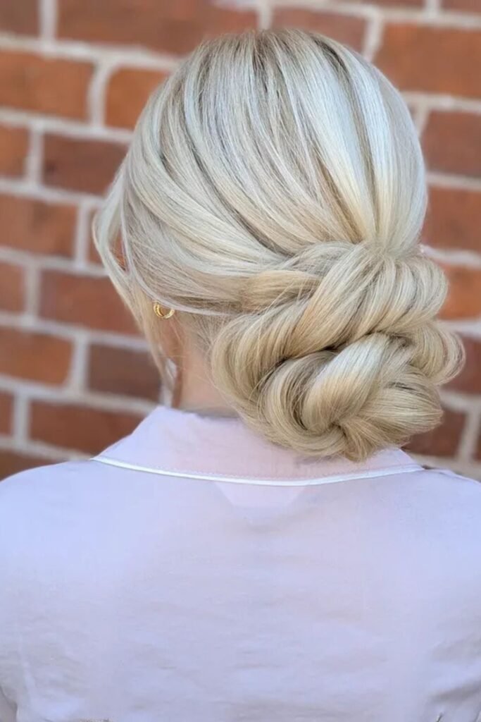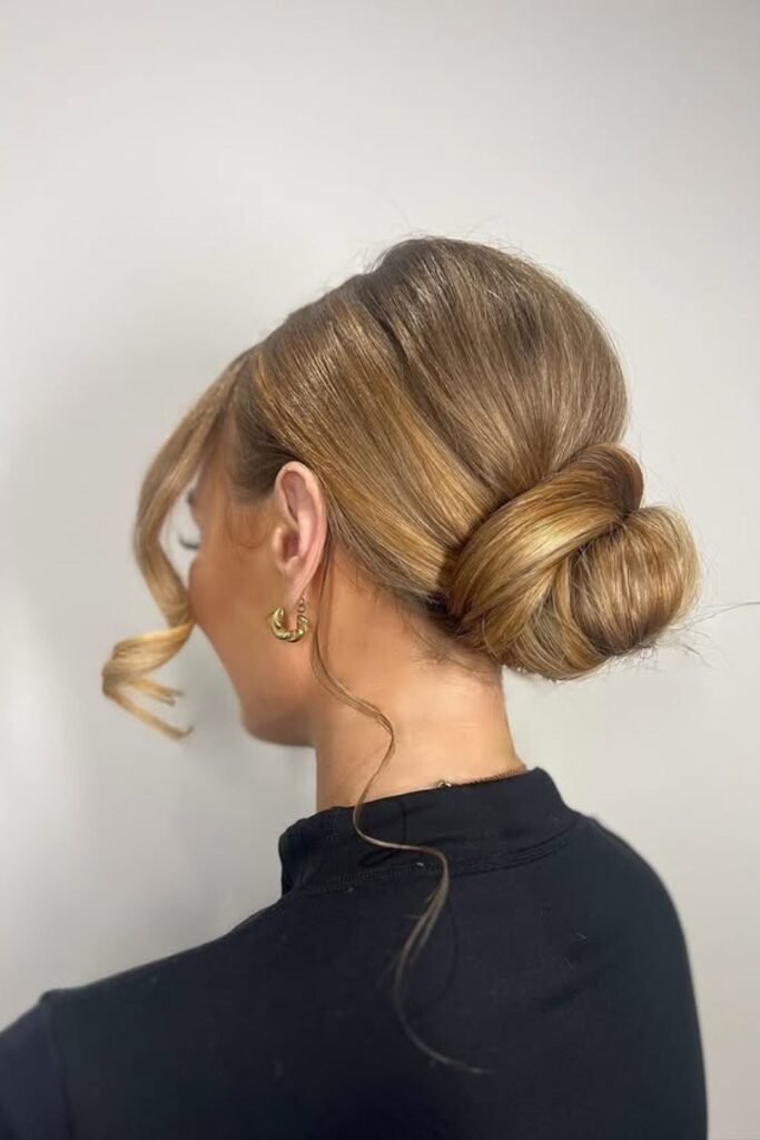 Soft side pieces set the tone for this elegant low bun, especially if you want something polished without feeling stiff.