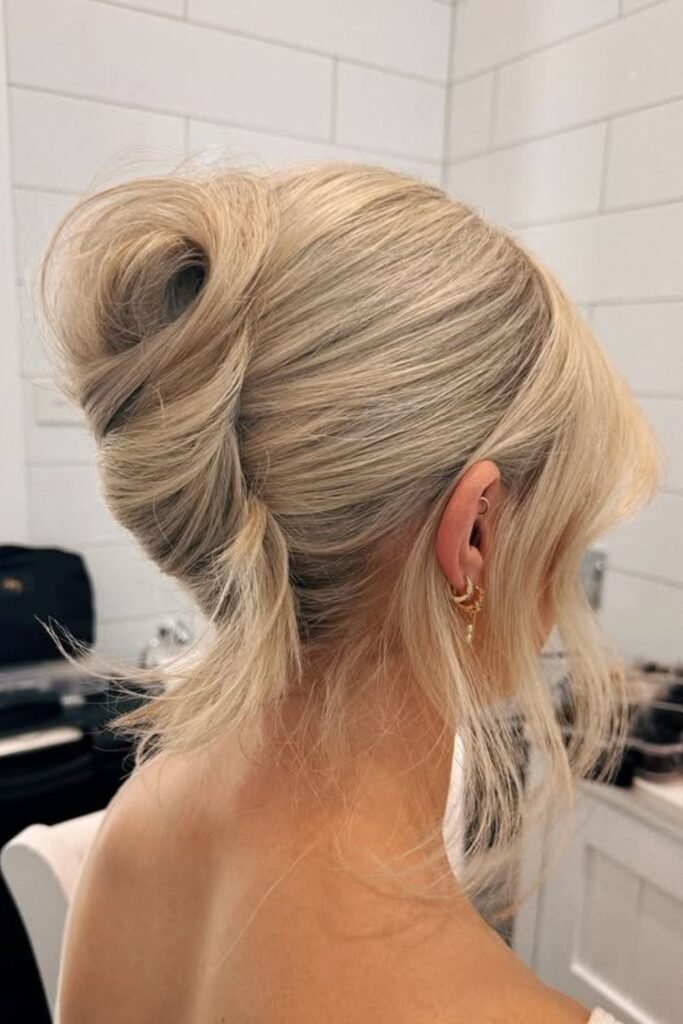 Lift at the crown gives this bun its lively shape, especially when the top sections are kept loose so the volume stays soft instead of stiff.