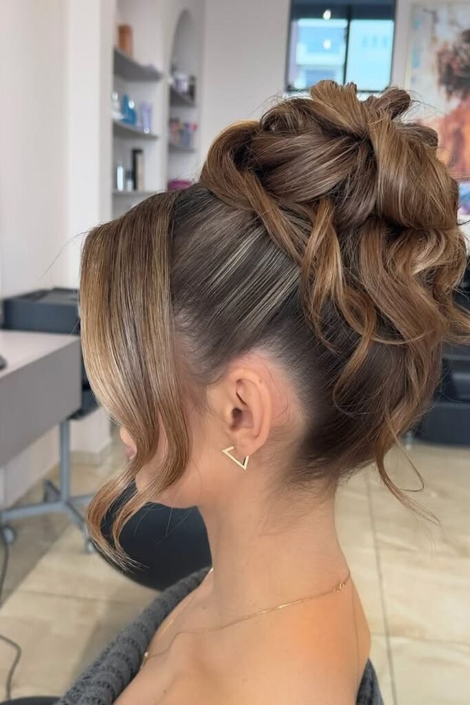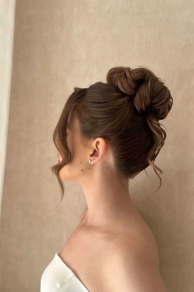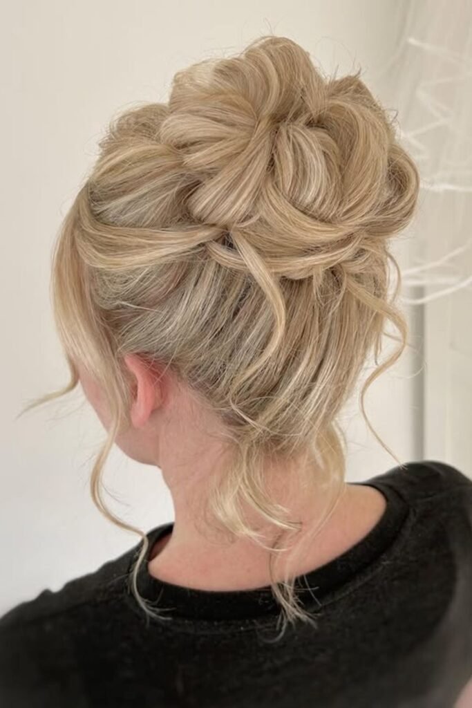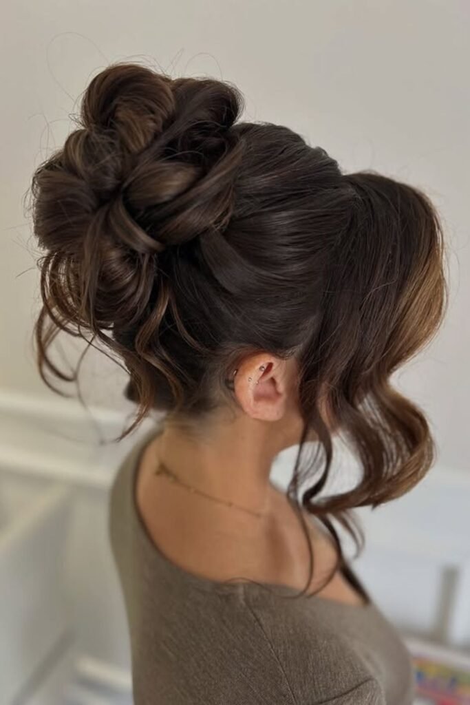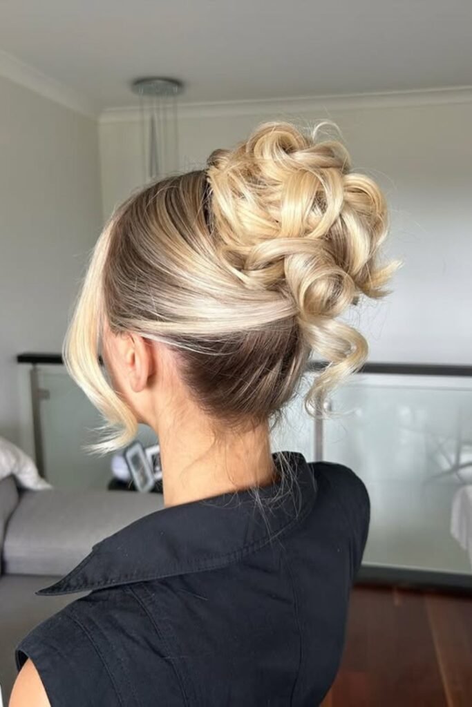 Lifted curls shape the entire top section here, giving the bun a full, crown-like finish that stands out without feeling heavy.