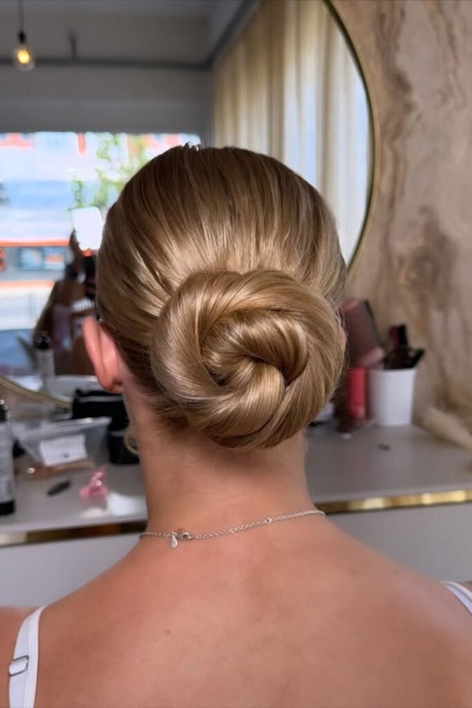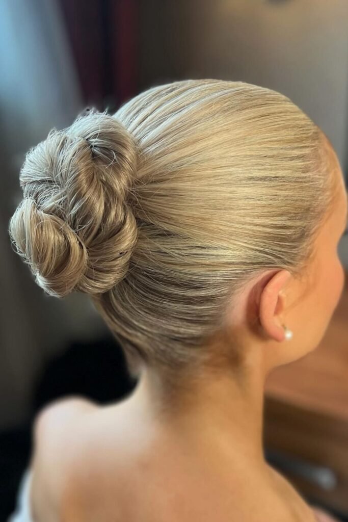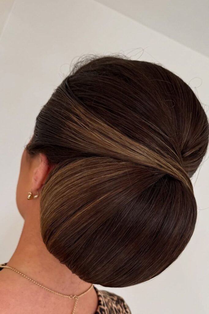Sleek roots set the tone for this tidy twisted bun, making it a strong pick when you want everything to stay smooth from front to back.