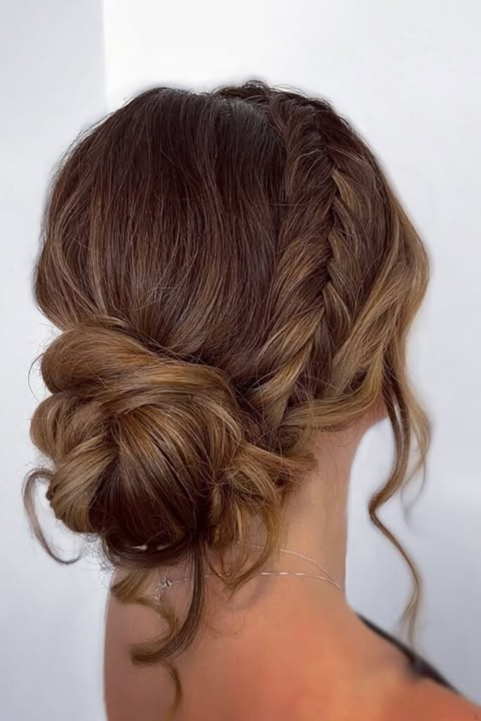 The braid gently moves the hair toward the nape, which makes the bun naturally take on a loose, round shape.