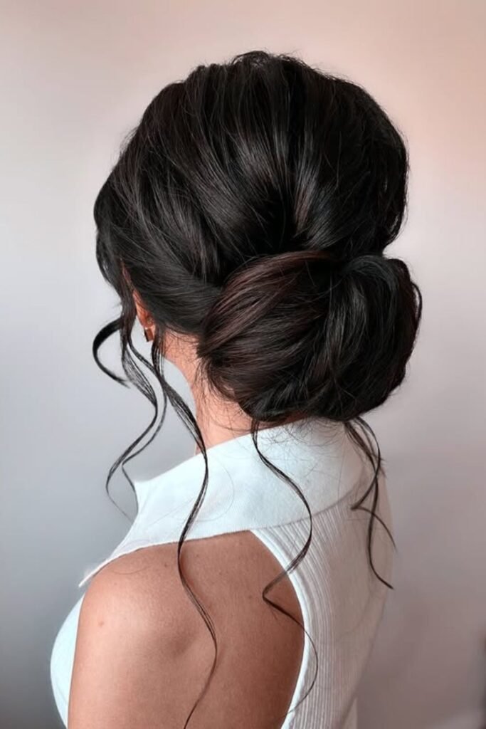 Face-framing curls set the mood here, especially if you’re aiming for a bun that looks relaxed but still intentional.