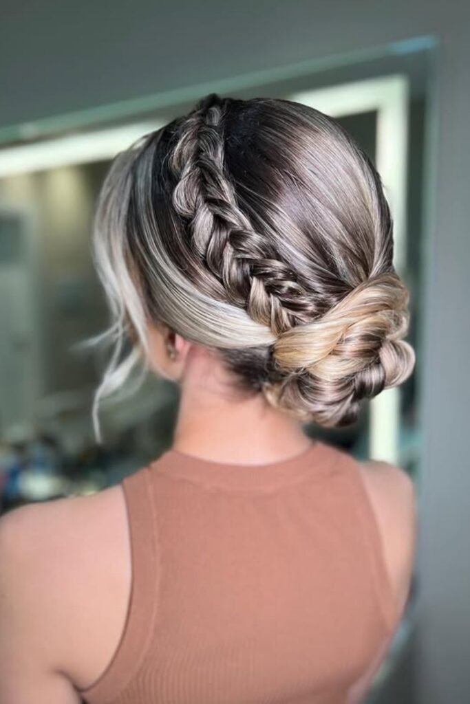 The braid running along the hairline sets the whole shape in motion, guiding everything back into a rounded low bun without looking too tight.