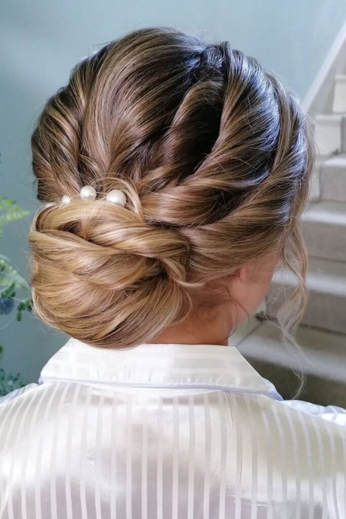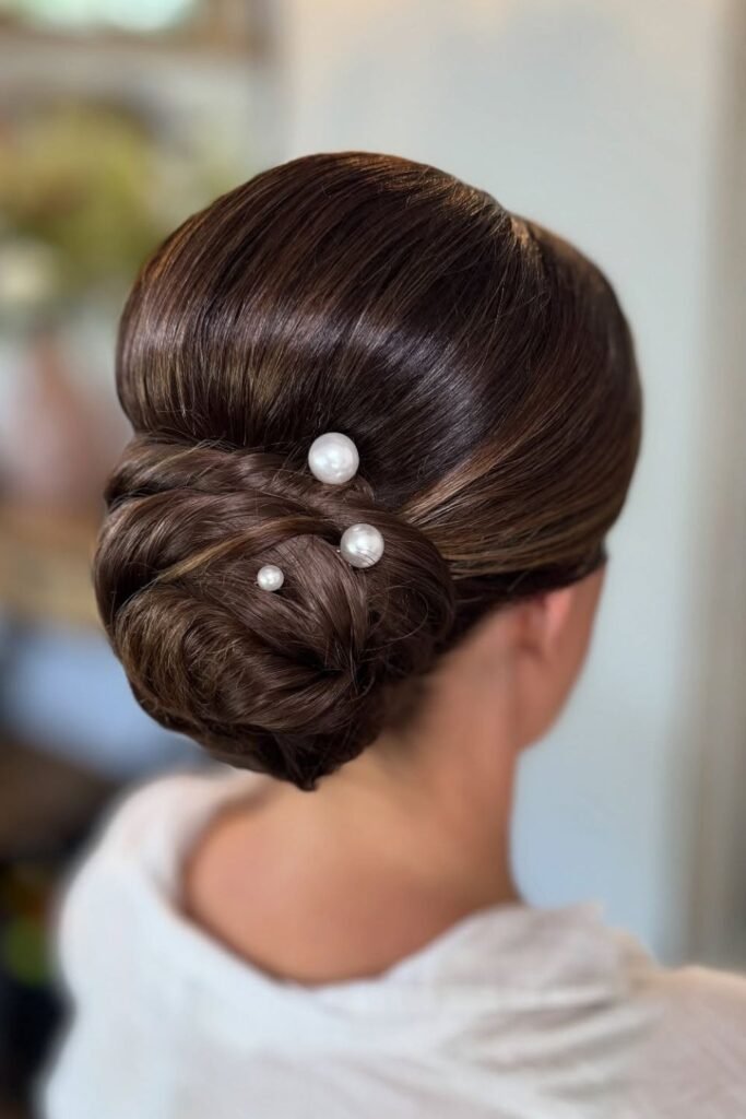 Pearl pins instantly change the mood of this bun, especially when the hair is wrapped in a layered twist that naturally builds height through the back.