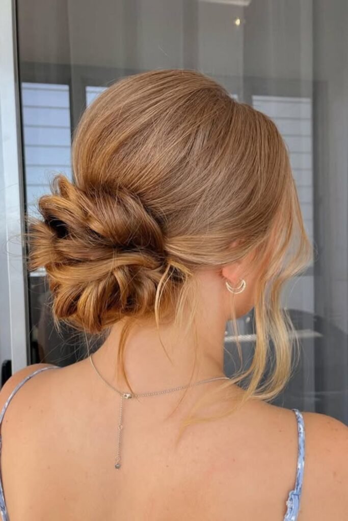 Gentle twists shape this bun into a relaxed, petal-style silhouette, which works beautifully when you want something pretty without feeling overly styled.