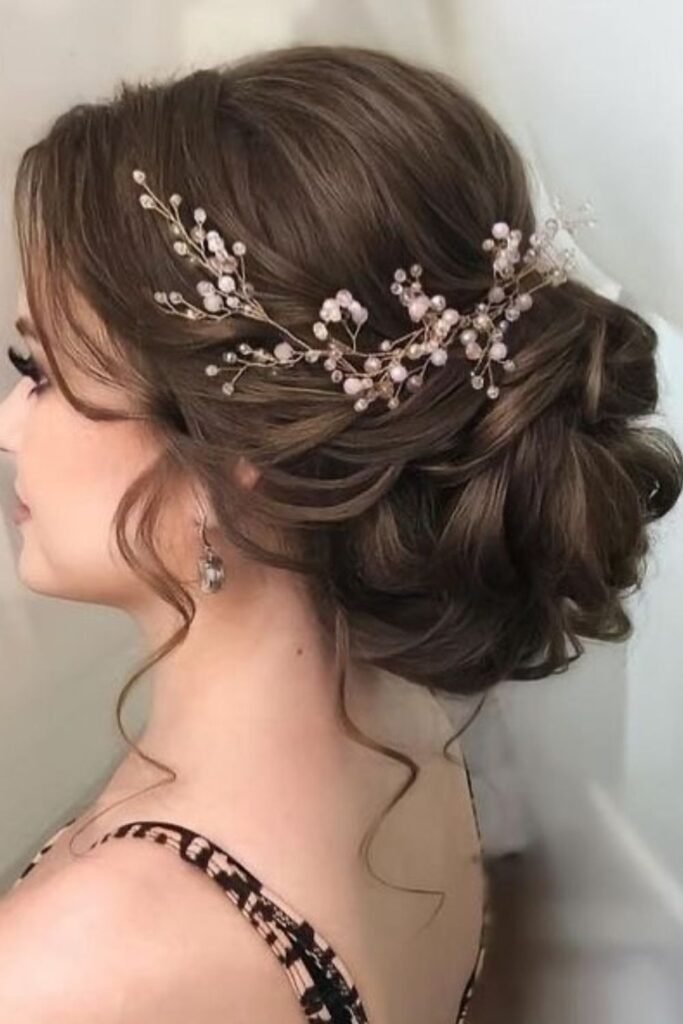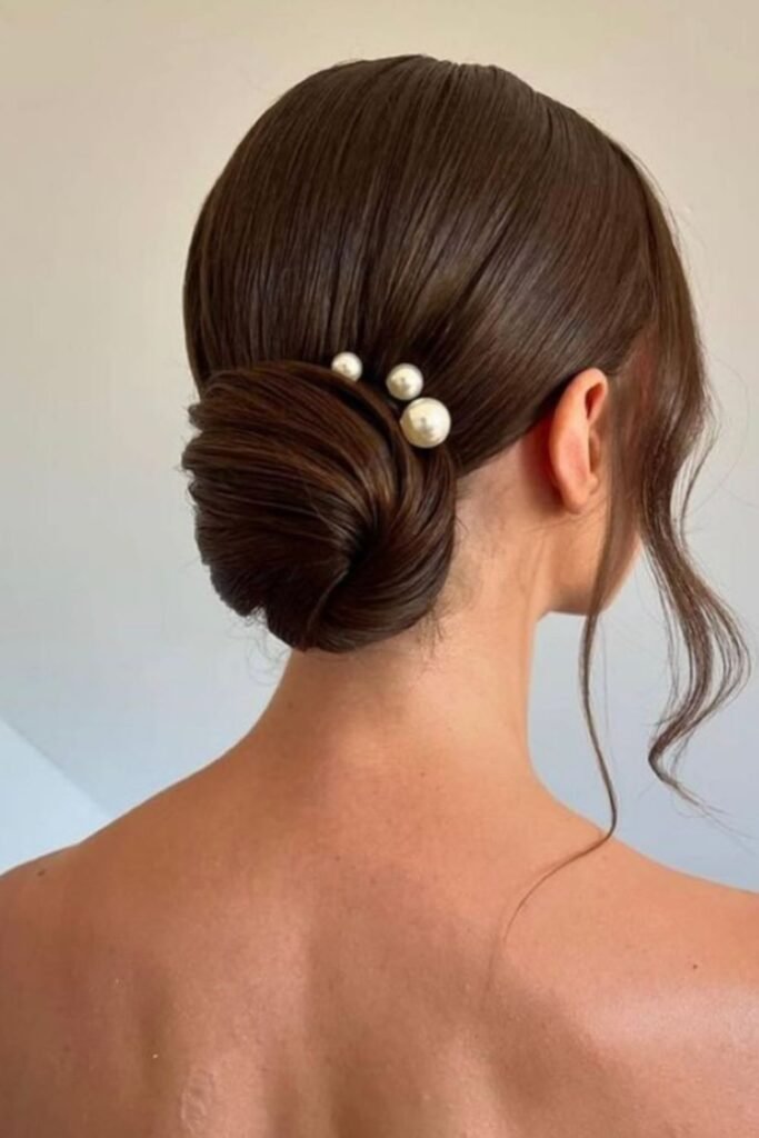 Pearls add a calm, polished touch to this low bun, which makes it a strong choice for evenings or any event where you want a clean finish without heavy styling.