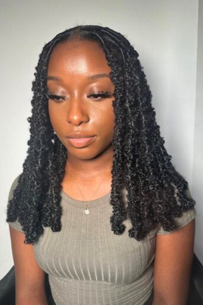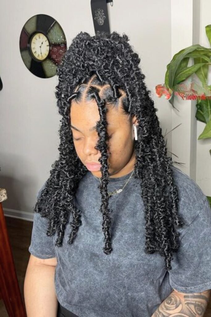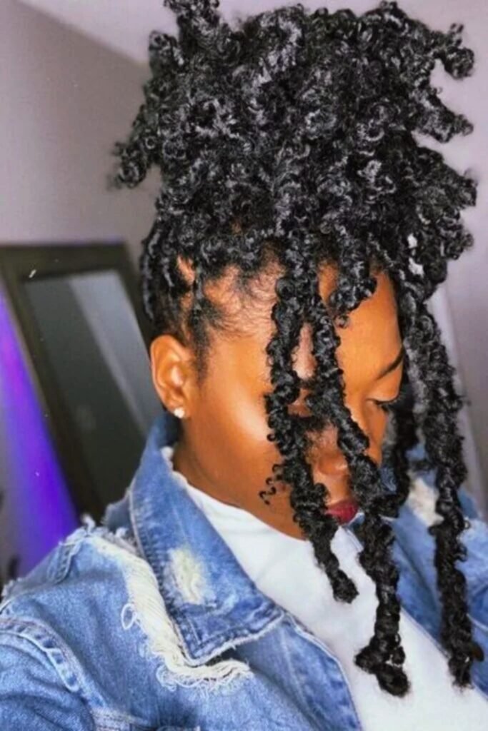 Curly butterfly locs styled into a high bun create a look that’s both playful and elegant.