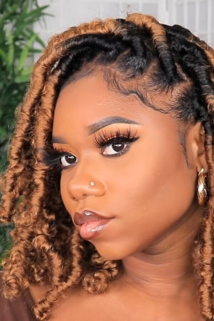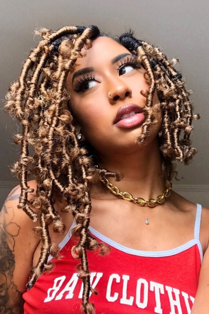Golden-tipped butterfly locs bring warmth and brightness to the hairstyle, with the golden highlights adding a striking contrast against the darker base.
