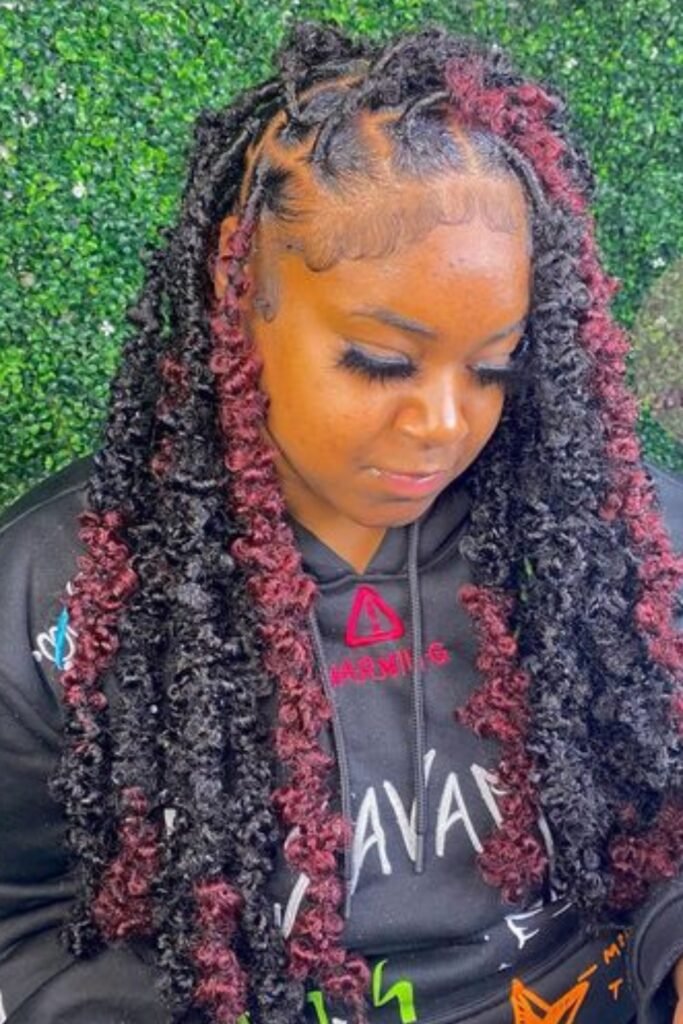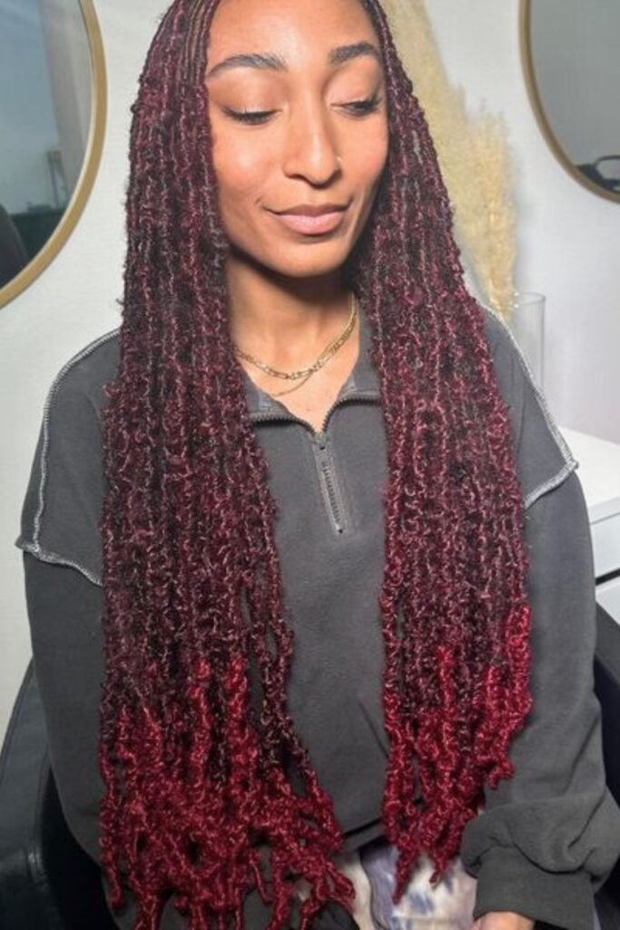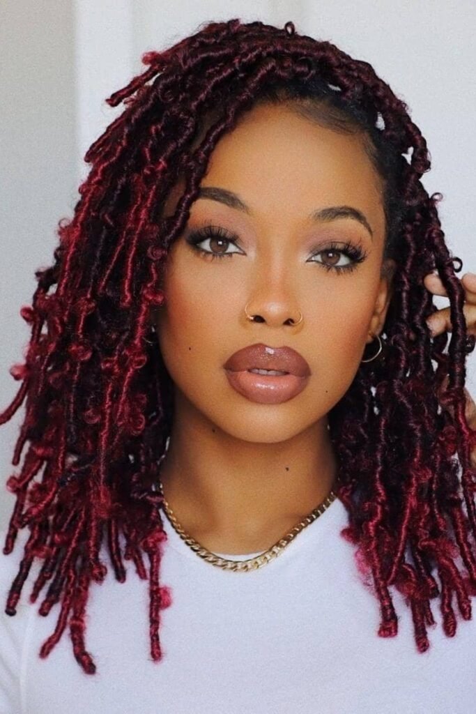 Burgundy butterfly locs bring a vibrant pop of color to the traditional style. The deep red hue intensifies the locs’ texture, giving them a rich and bold appearance.