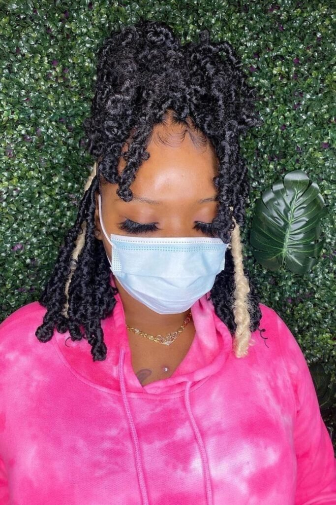 Black and blonde butterfly locs create a striking contrast with their bold color combination.