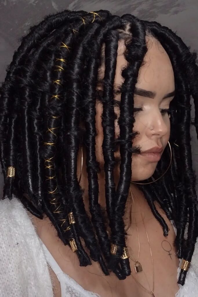 The contrast between the dark locs and the gold accents creates a striking visual effect, making the hairstyle both stylish and glamorous.