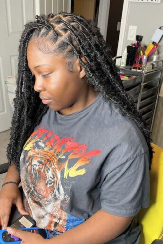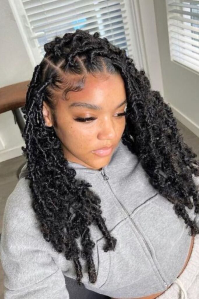 A half-up, half-down butterfly locs style combines the best of both worlds, offering structure and flow.