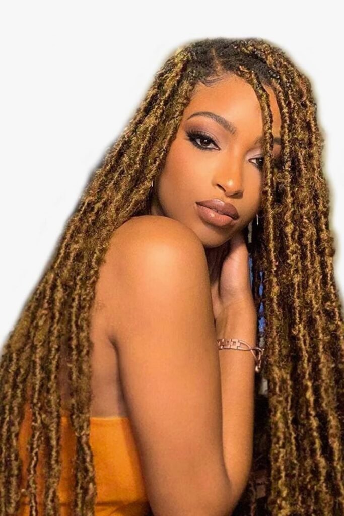 Multi-toned butterfly locs blend different shades of brown and blonde, creating a dynamic, sun-kissed effect.