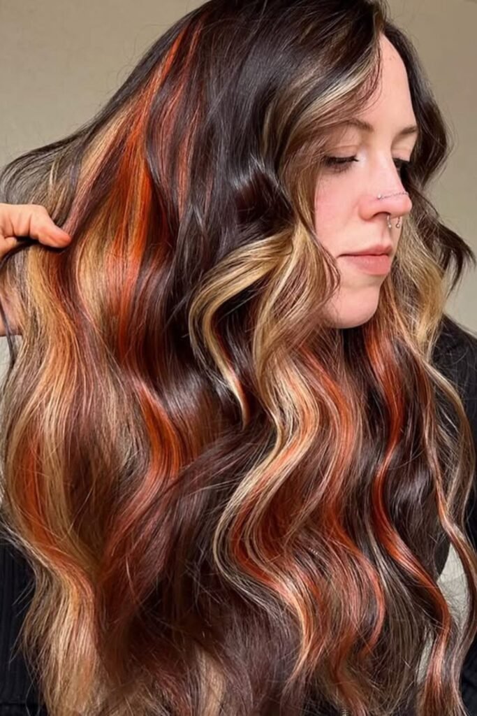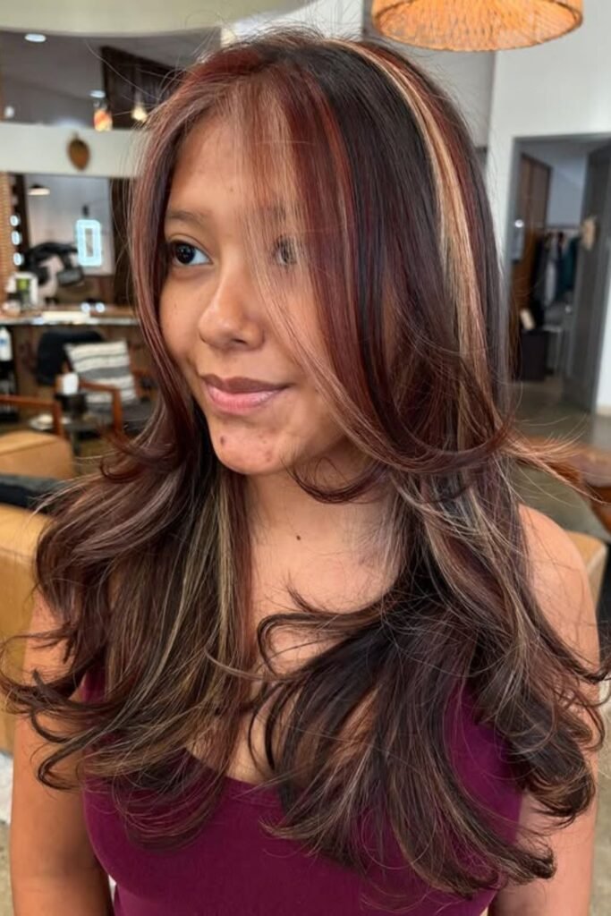 Face-framing copper and blonde lines open up long layers instantly, which helps if your dark base tends to swallow lighter tones.