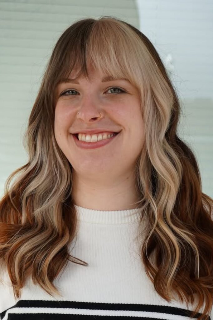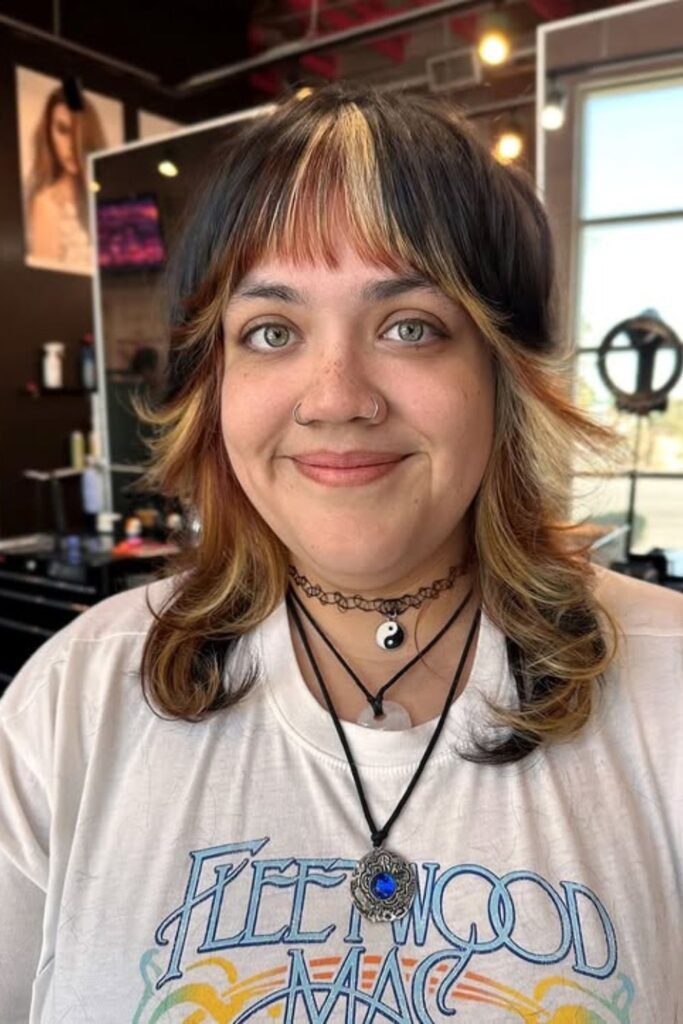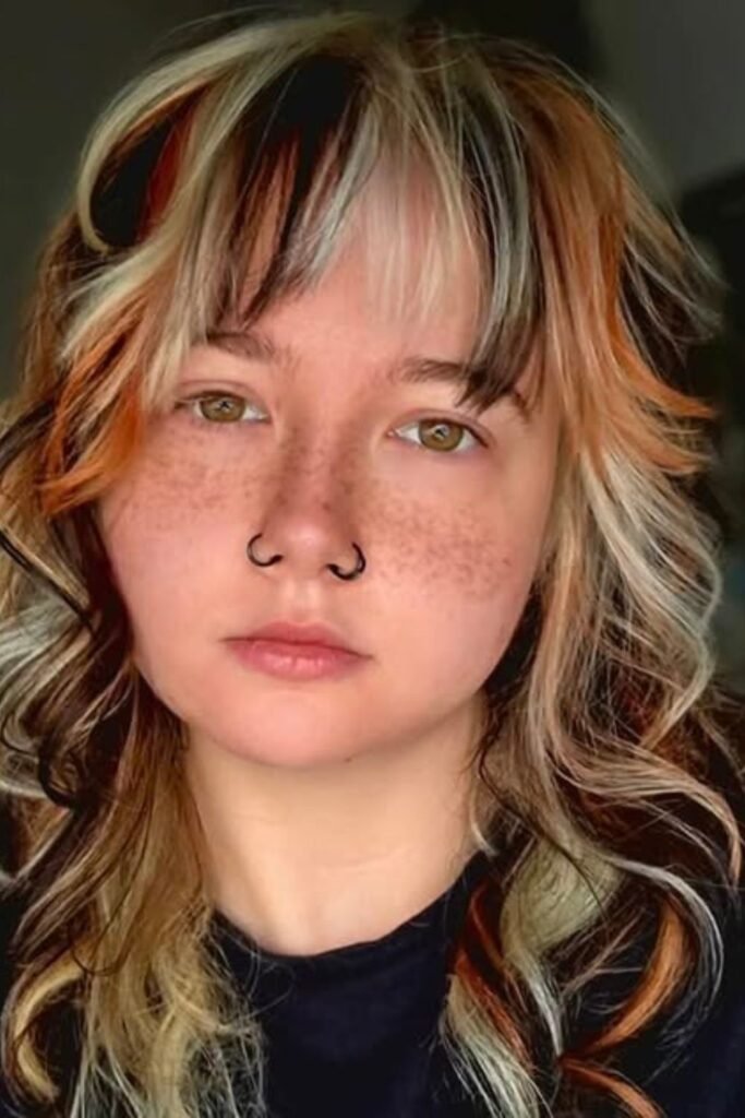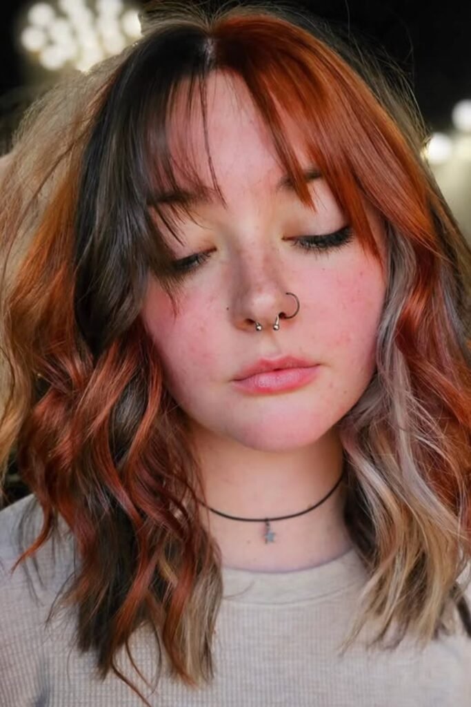Honey-copper lengths with a light blonde fringe make an easy version of calico that works for anyone who needs contrast without strong color blocks.