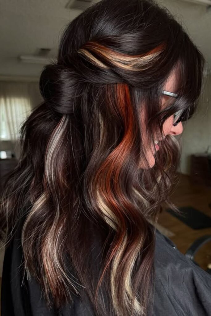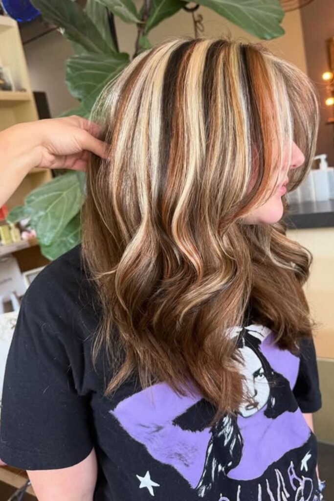 Medium-brown hair can tolerate broader blonde or copper panels without the color being out of place.