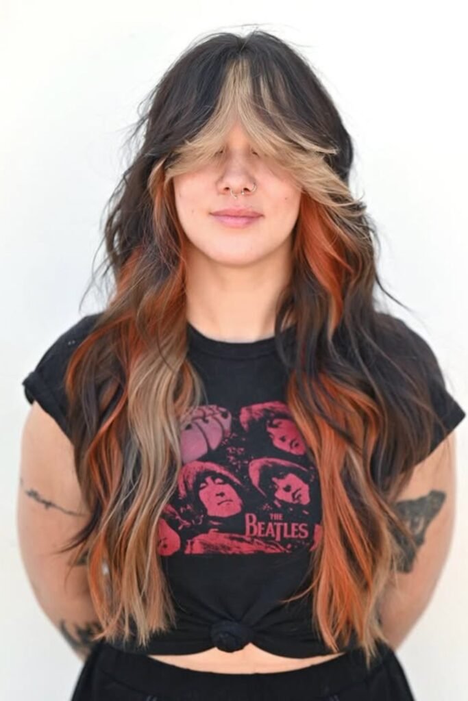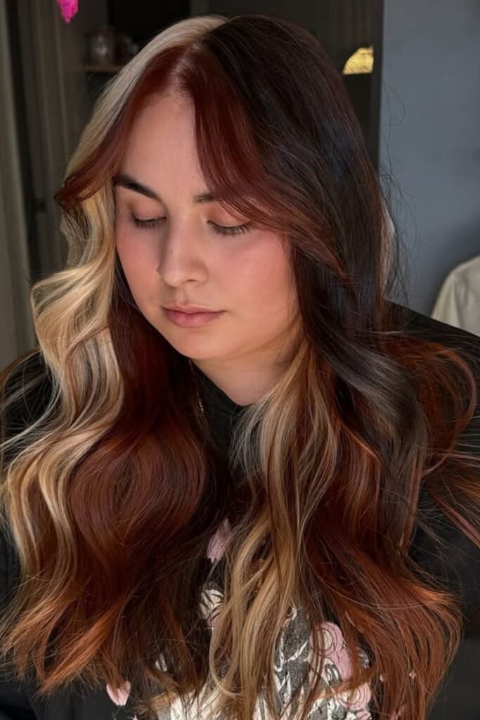 Warm copper flowing through one side and icy blonde on the other gives long hair a dramatic calico layout without needing vivid shades.