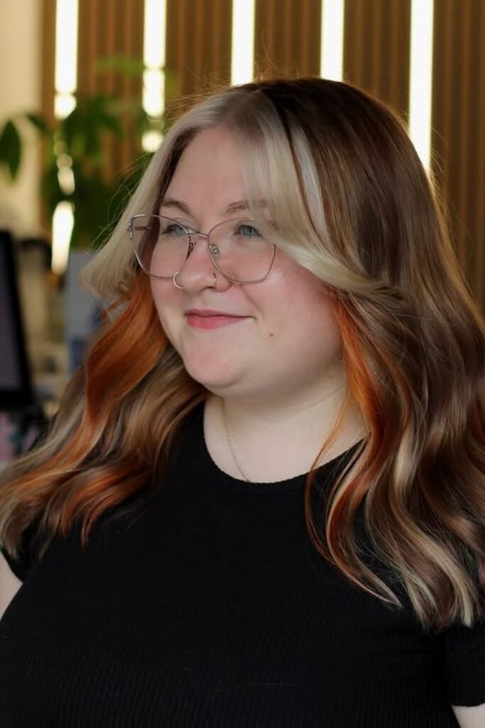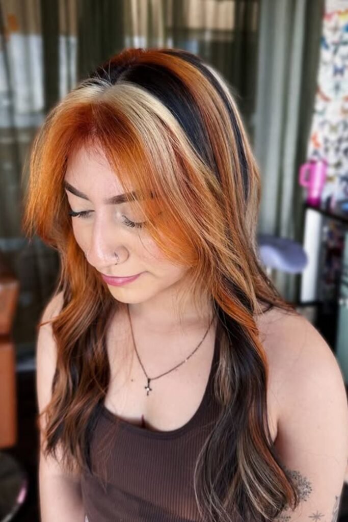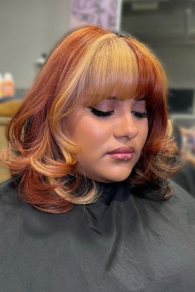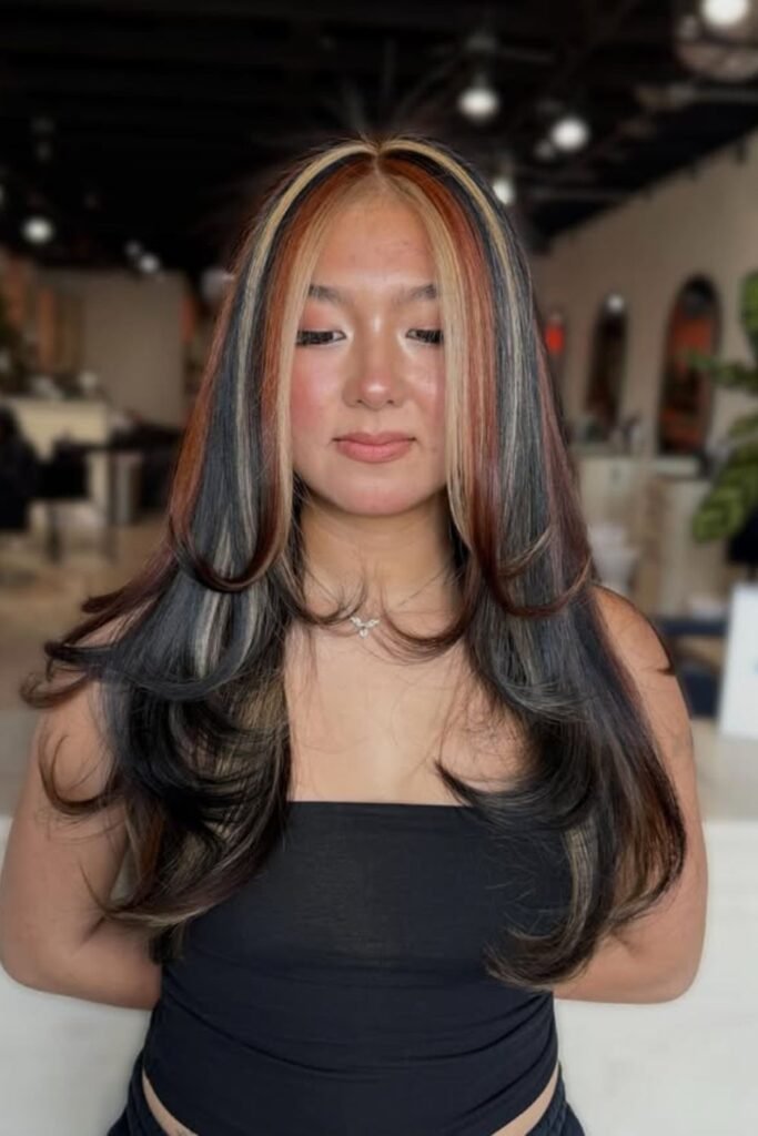 Blonde placed tight along the part lifts the whole look, while copper through the mids adds warmth that flatters most skin tones.