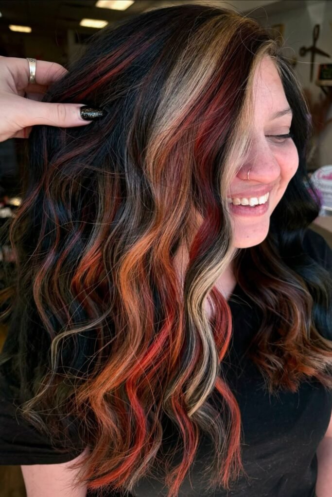 Deep black lengths make fiery red, copper, and blonde slices show full contrast, it is great if you want bright color without bleaching anything.