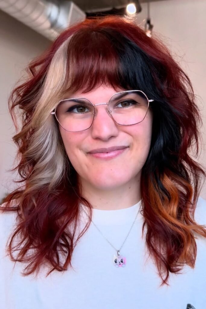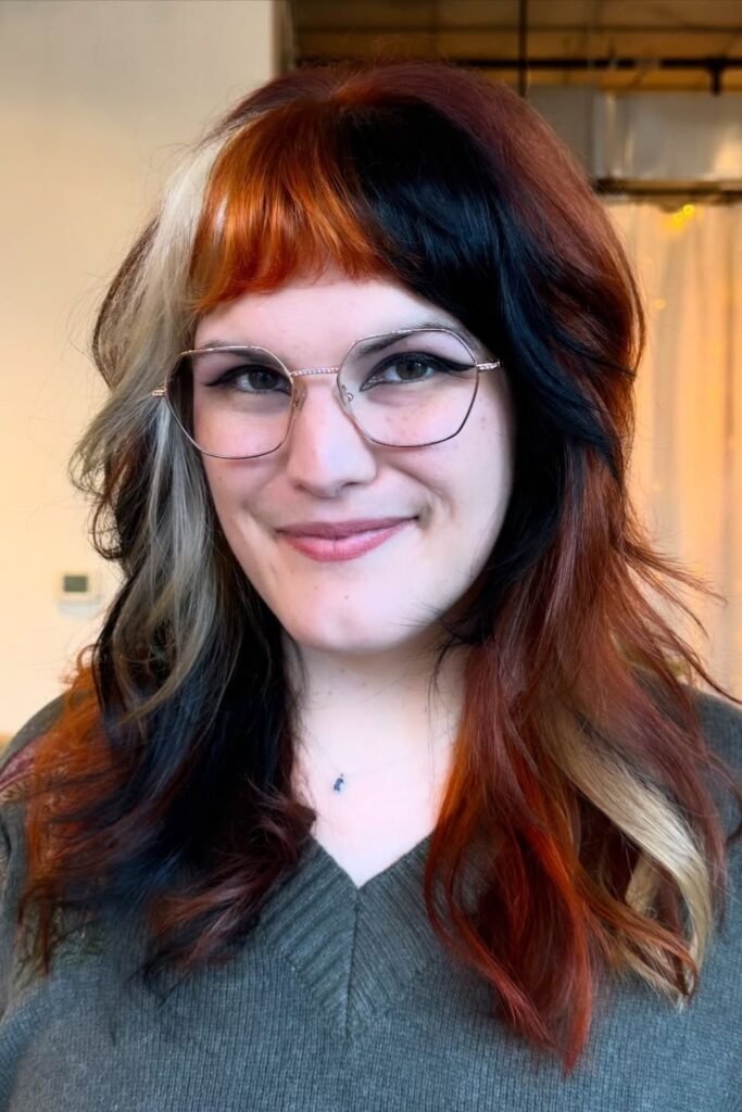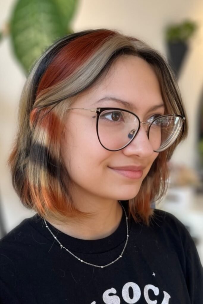 Copper sitting right at the fringe brings instant brightness to the face, while the black and blonde side panels create that sharp calico contrast without needing a full split.