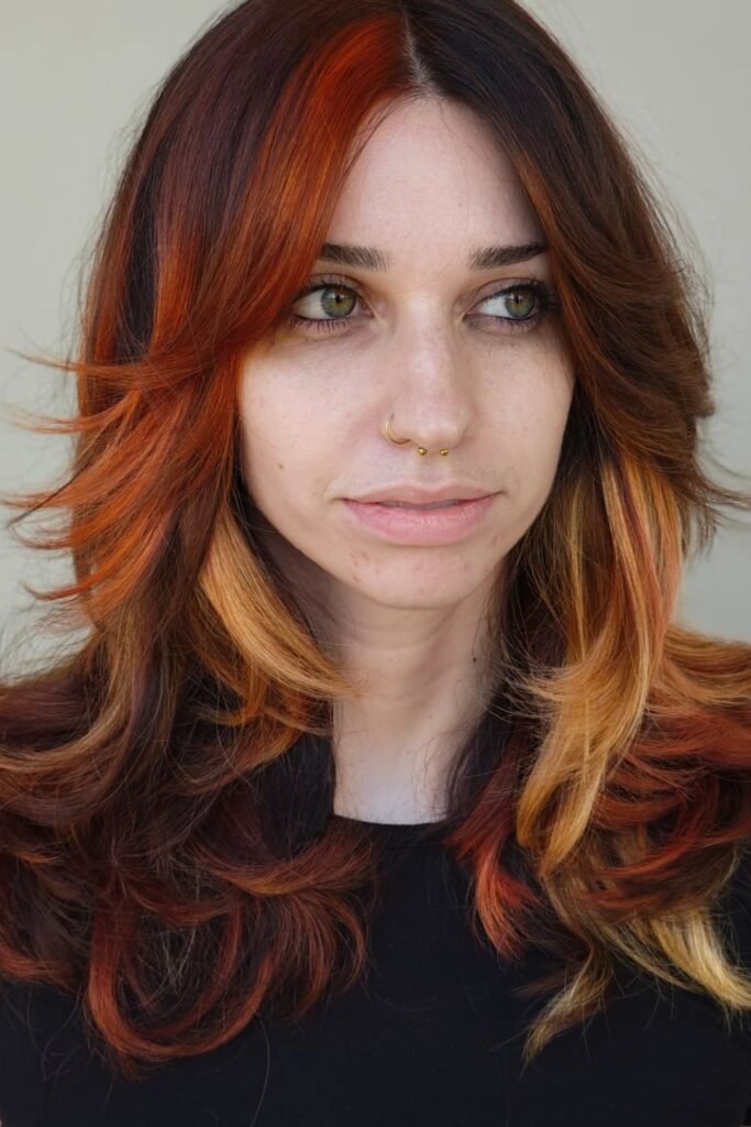 Vibrant copper through the crown gives instant lift to straight or fine hair, especially when paired with warm strawberry lows.